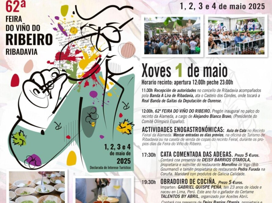 A Feira do Viño do Ribeiro regresa un ano máis a Ribadavia, corazón histórico do viño galego, para celebrar a súa 62ª edición. Durante catro días, poderás gozar dos mellores viños da Denominación de Orixe Ribeiro, acompañados de gastronomía local, música en directo, obradoiros, catas comentadas e actividades para todos os públicos.
